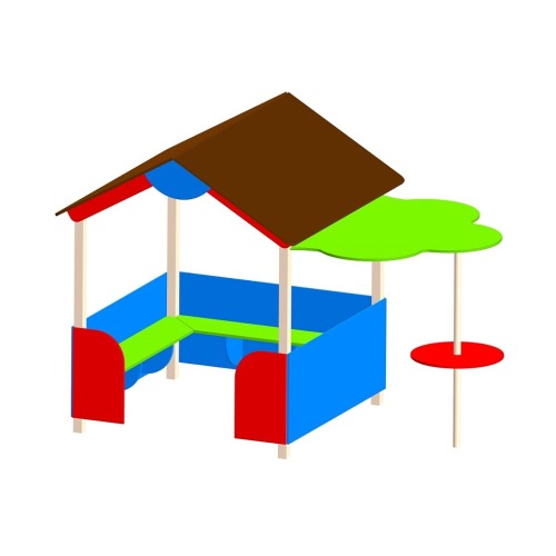 Детский домик Д-4.1 используется на детской площадке. Представляет собой домик под двускатной крышей, внутри скамеечки.