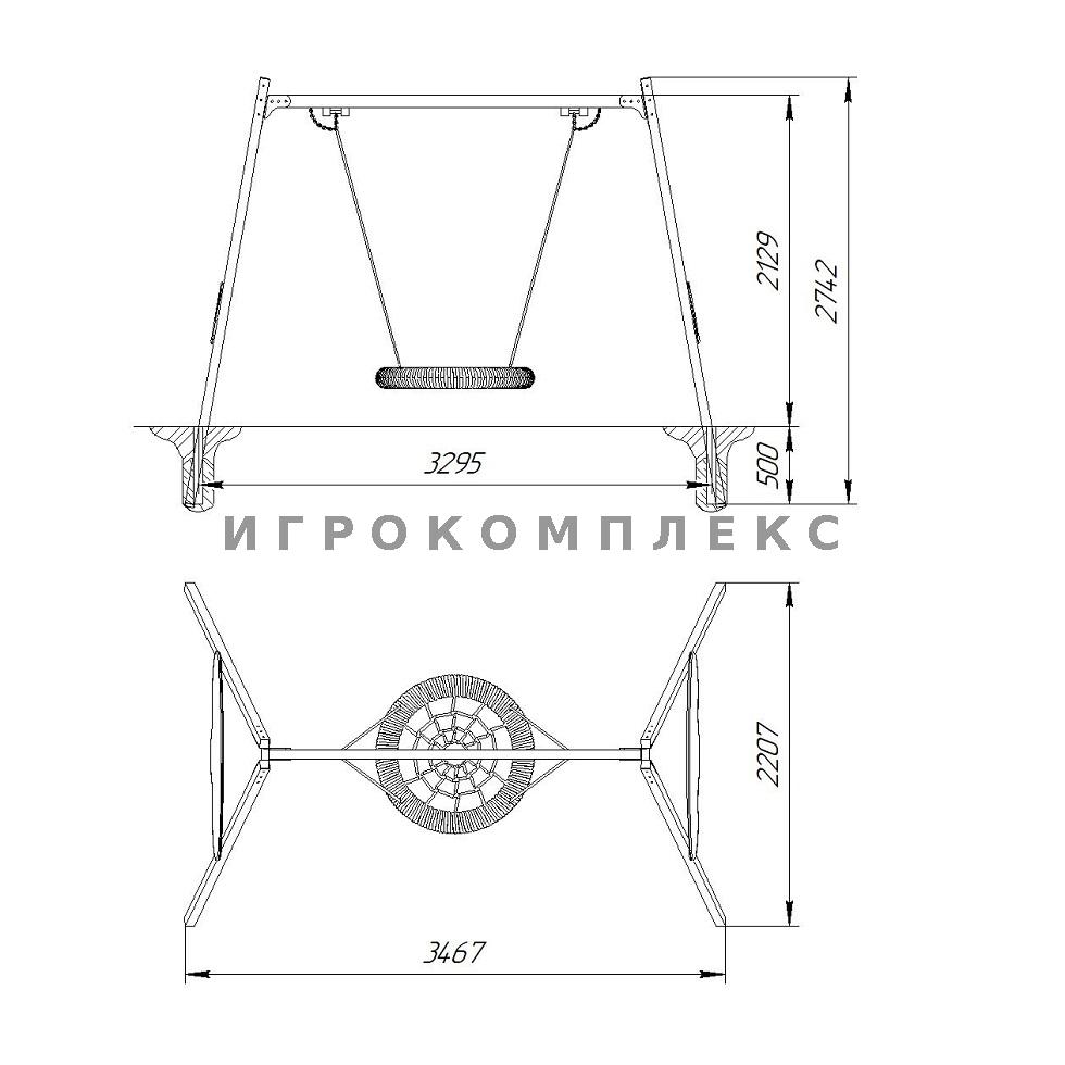 Материалы: труба 60х60, 60х80, подвес "Гнездо". Фанера ФСФ 15мм. Сиденье "гнездо" с максимальной нагрузкой до 250кг. Двухкомпонентные краски, стойкие к ультрафиолету и истиранию.