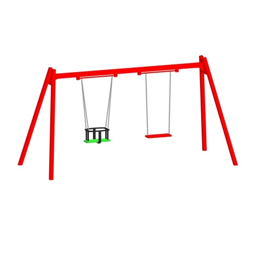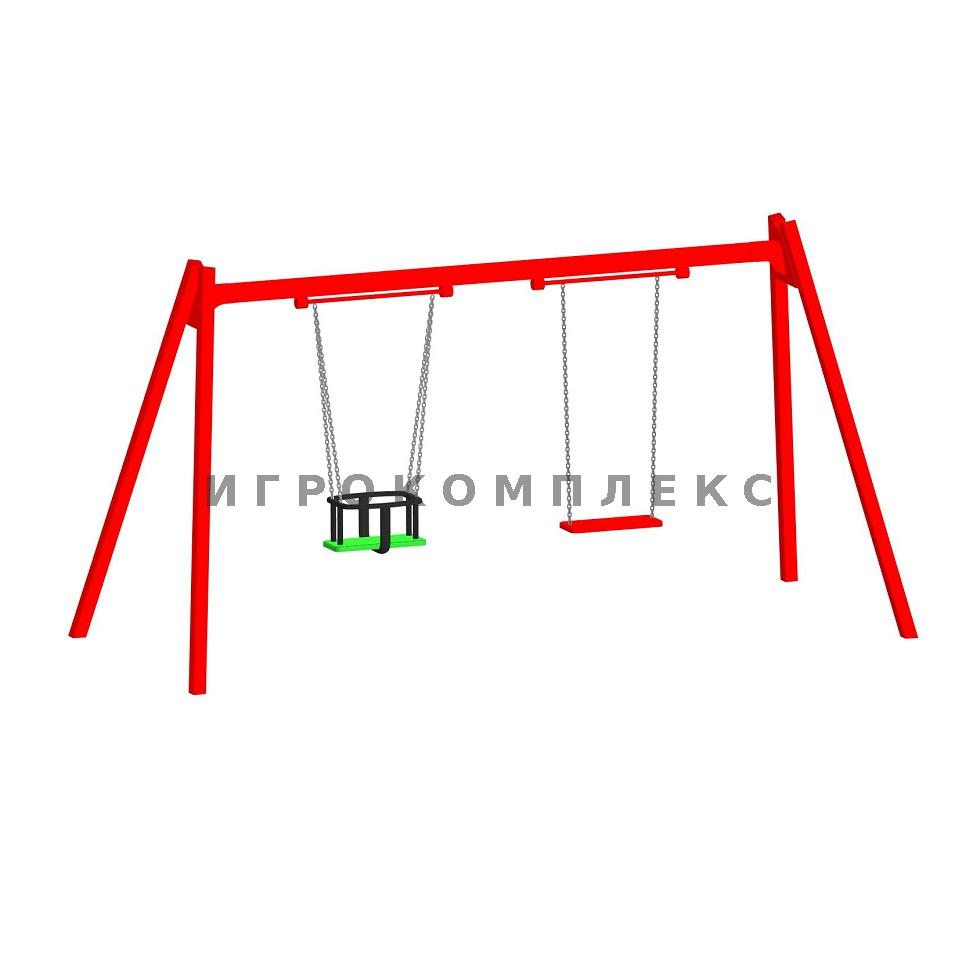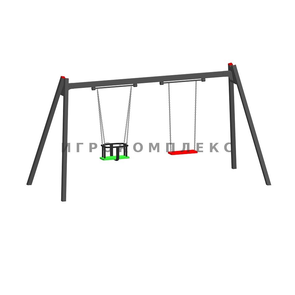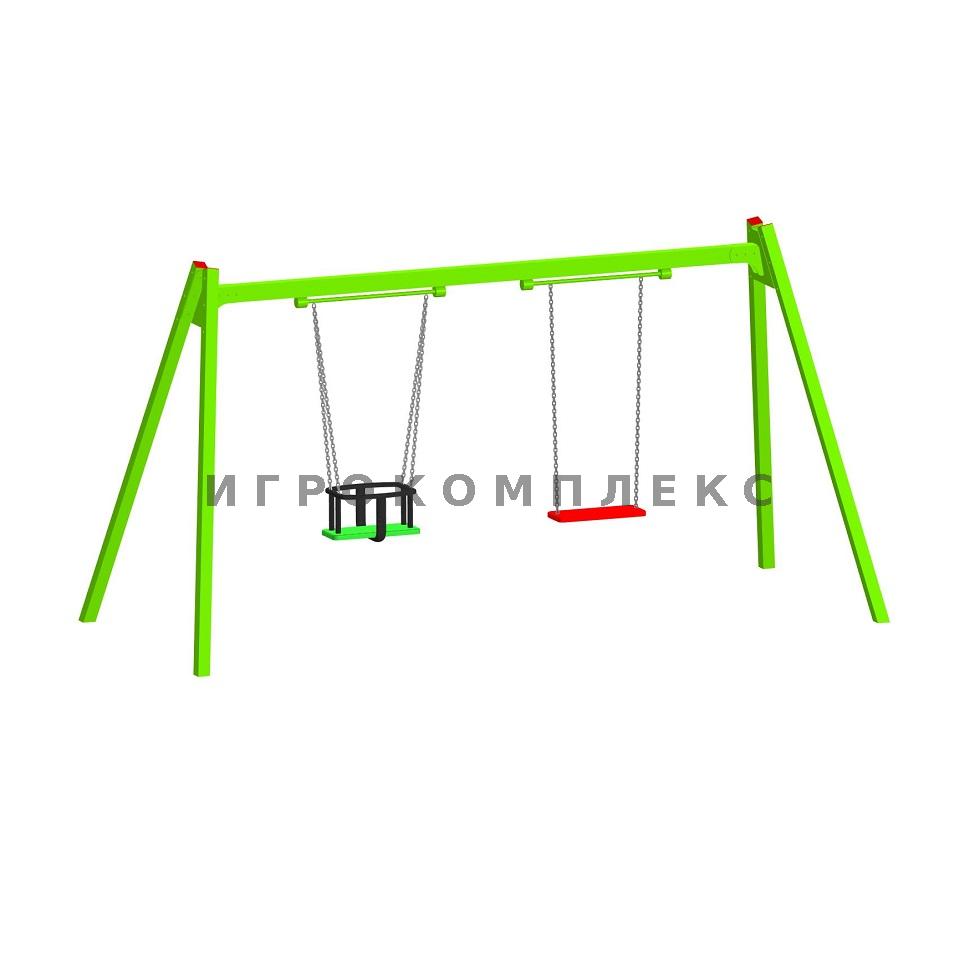 Качели детские двойные К-2.1-п4п5 с сиденьем люлька и резиновым сиденьем без спинки высотой 1,7м используются на детской площадке.