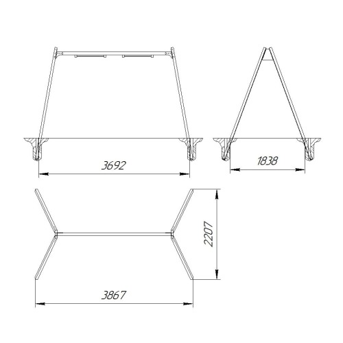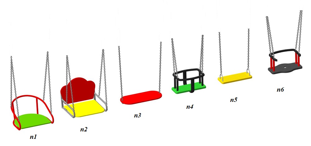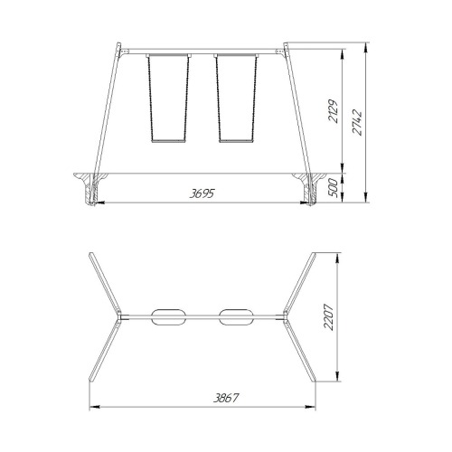 Качели детские двойные К-2.7-п4п5д2 с сиденьем люлька и резиновым сиденьем без спинки высотой 2,1м используются на детской площадке.