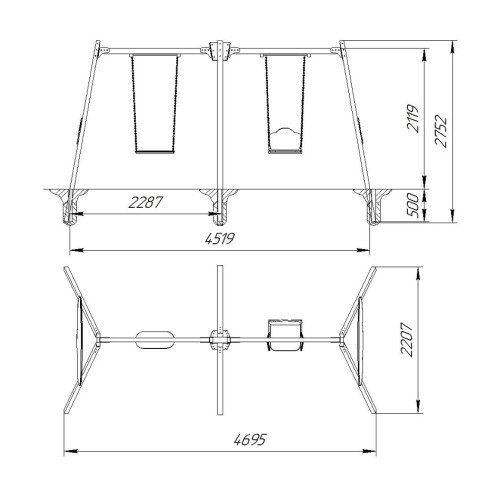 Качели детские двойные К-2.6-п3п3 с сиденьями без спинок высотой 2,1м используются на детской площадке.