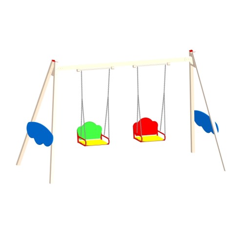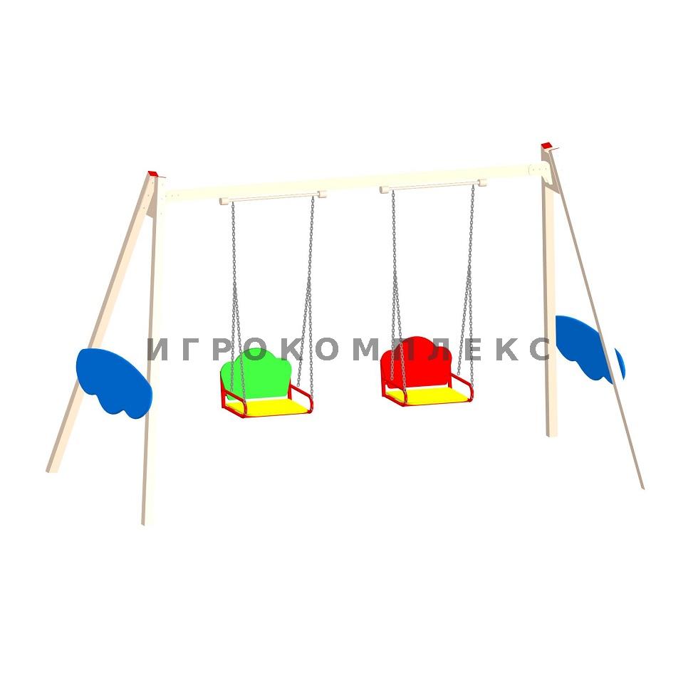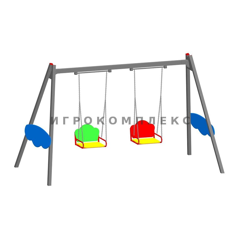 Качели детские двойные К-2.6-п2п2д1 с фигурными спинками высотой 2,1м используются на детской площадке.