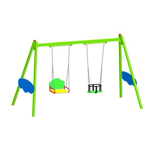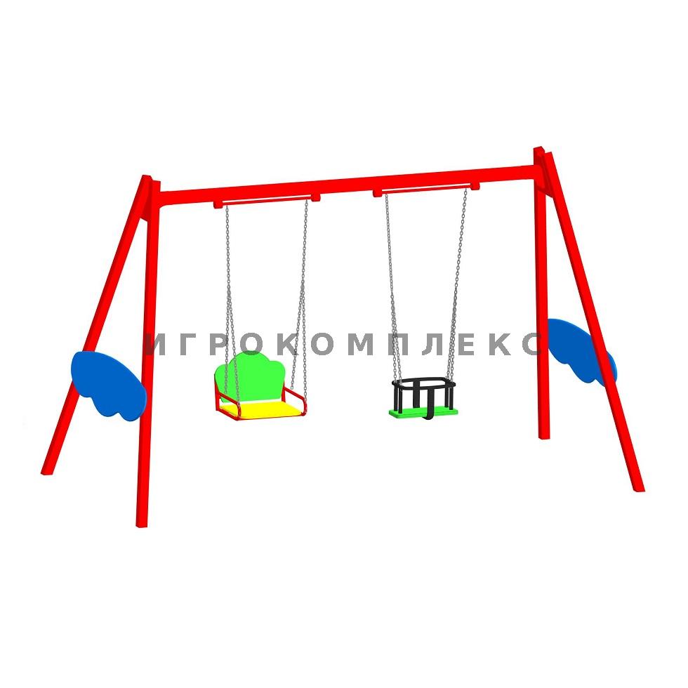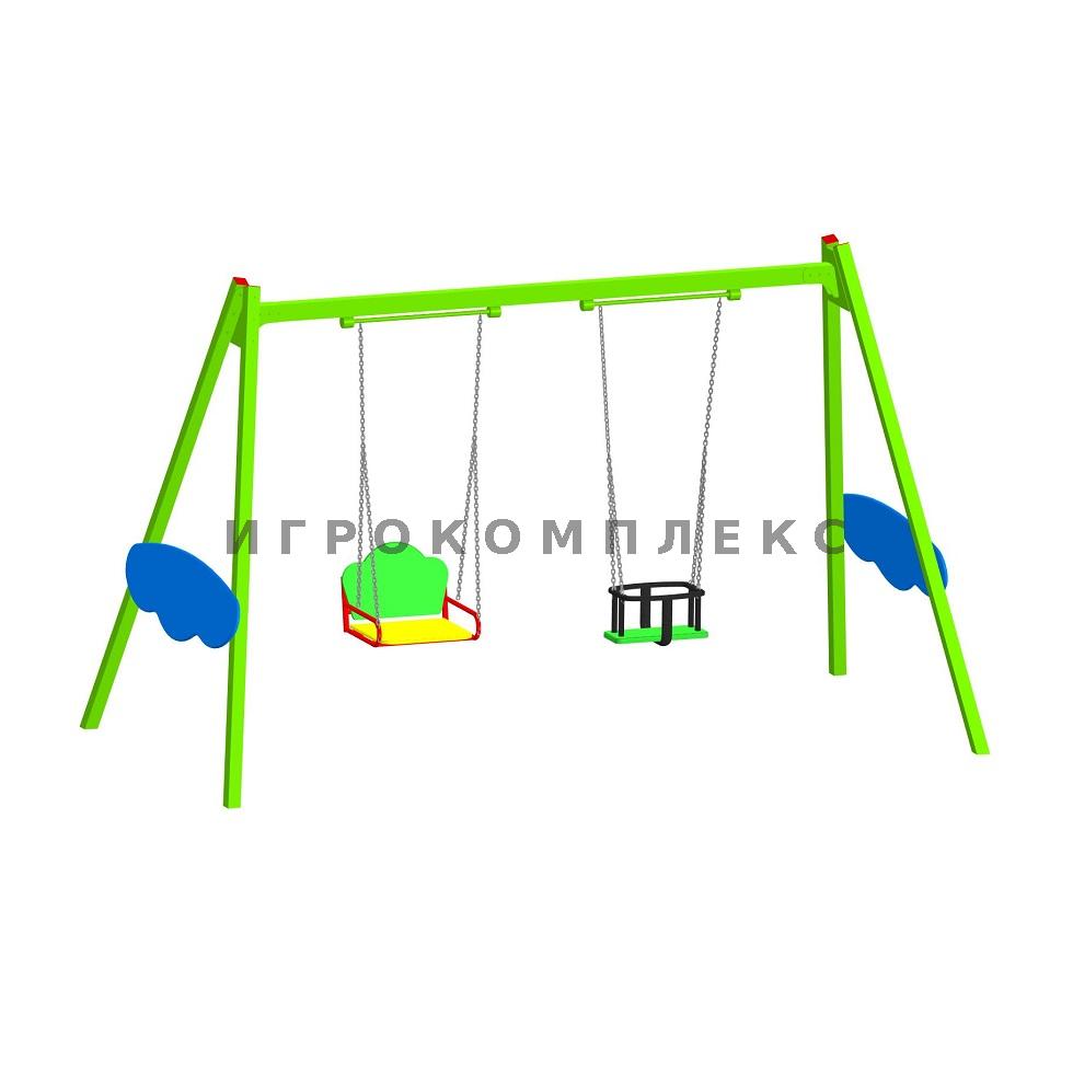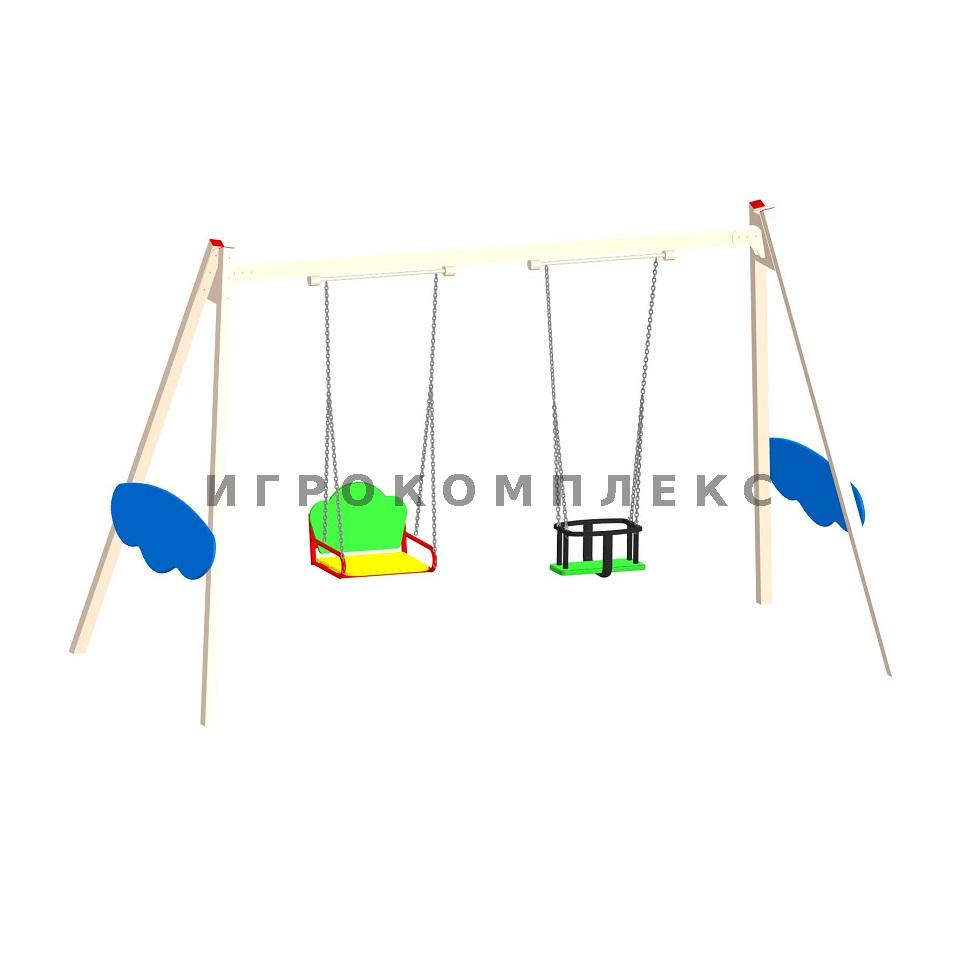 Качели детские двойные К-2.6-п2п4д1 с сиденьем с фигурной спинкой и сиденьем "люлька" высотой 2,1м используются на детской площадке.