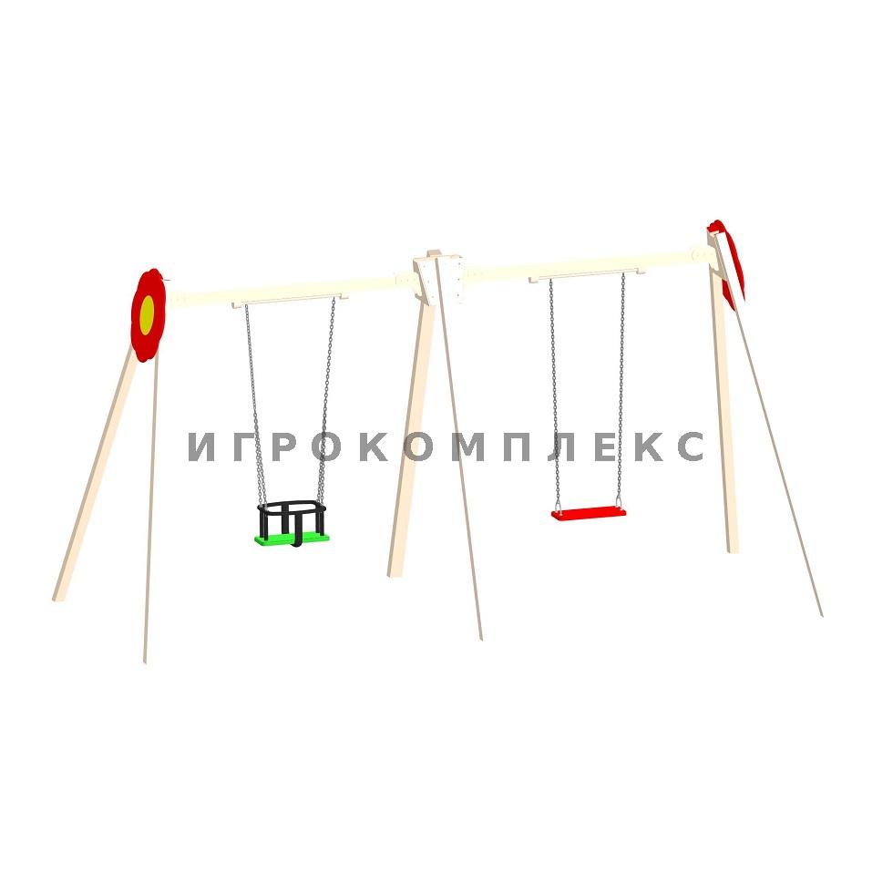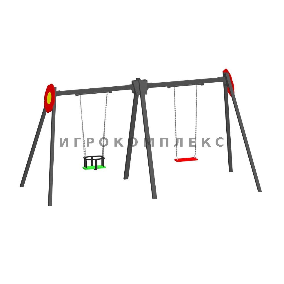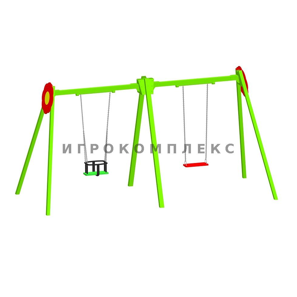 Качели детские двойные К-2.7-п4п5д2 высотой 2,1м используются на детской площадке.