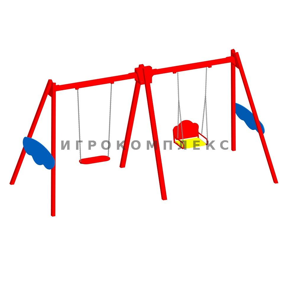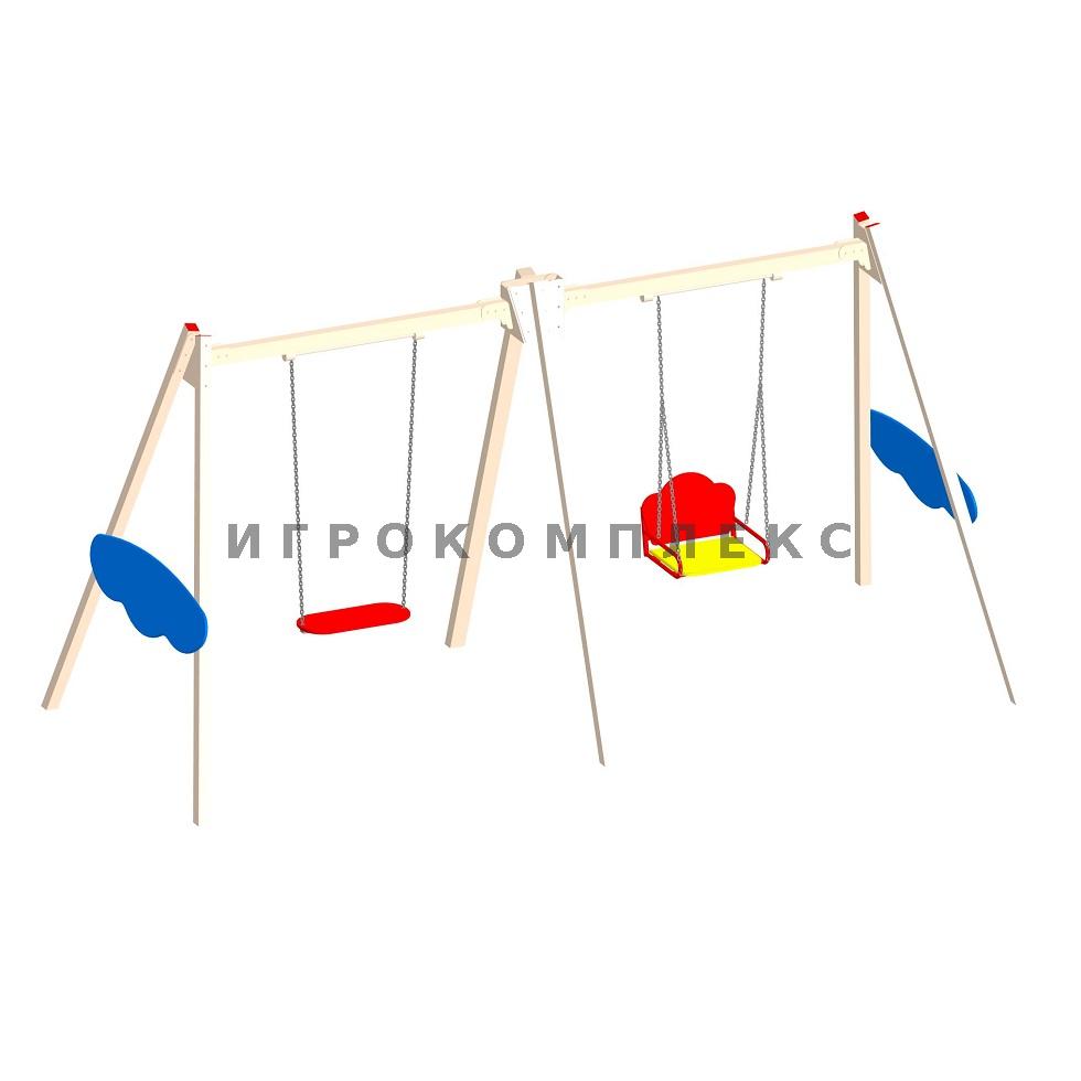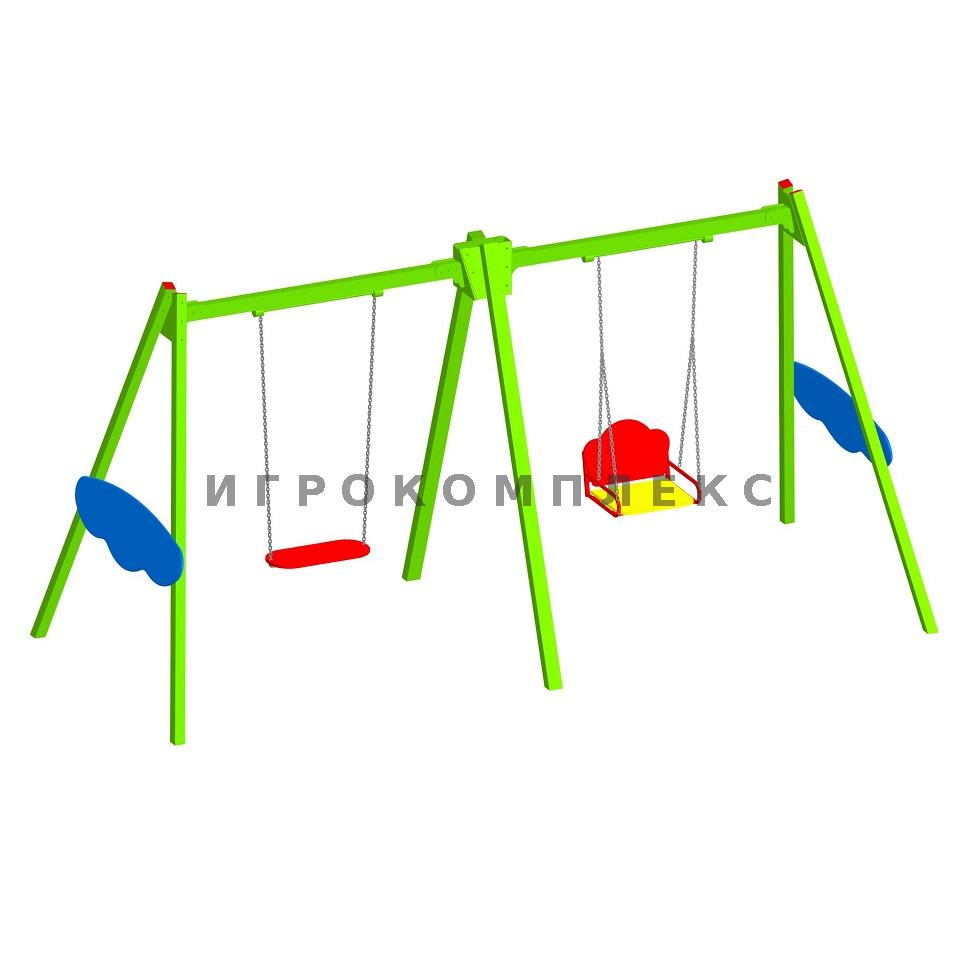 Качели детские двойные К-2.7-п2п3д1 высотой 2,1м используются на детской площадке.