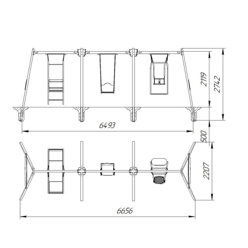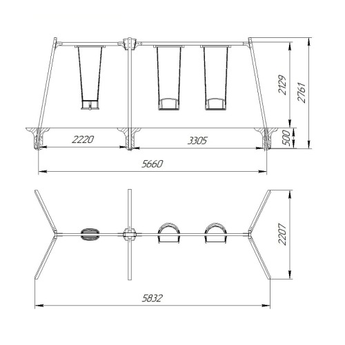 Качели детские К-3.5 комбинированные для трёх подвесов с сиденьем высотой 2,1м используются на детской площадке.