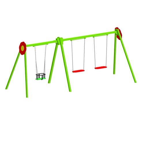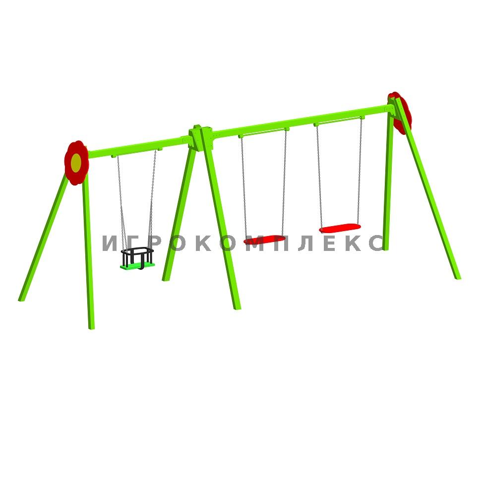 Качели детские тройные К-3.5-п3п3п4д2 комбинированные высота 2,1м с сиденьями без спинки используются на детской площадке.