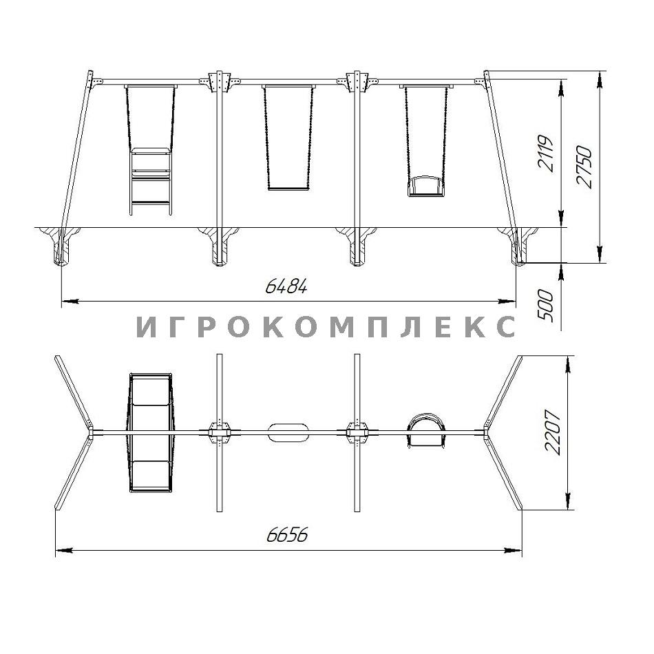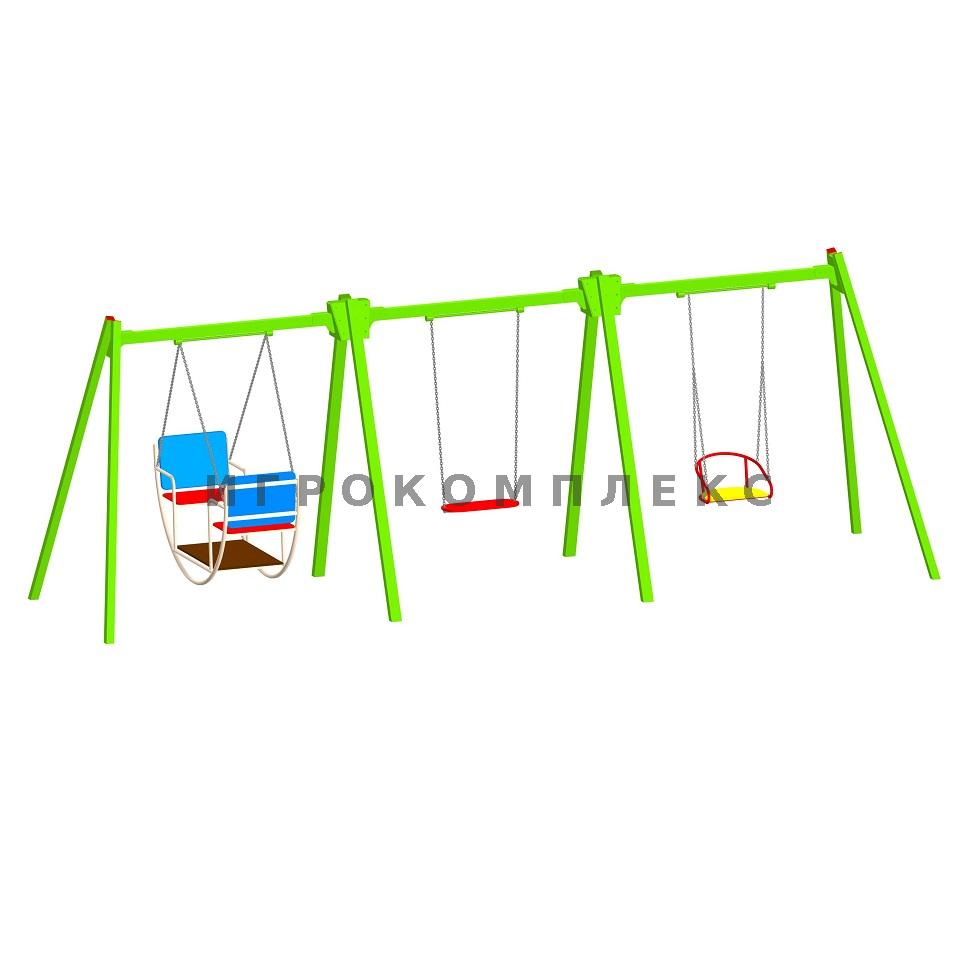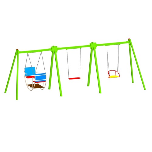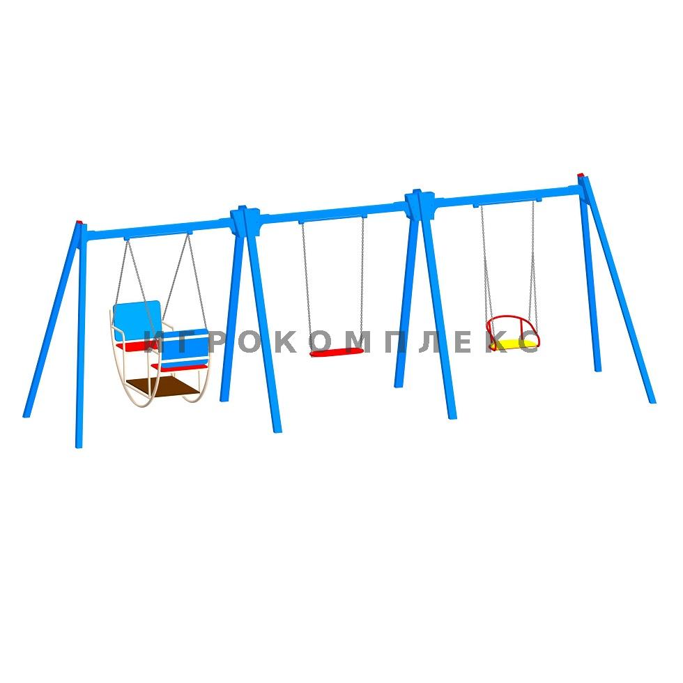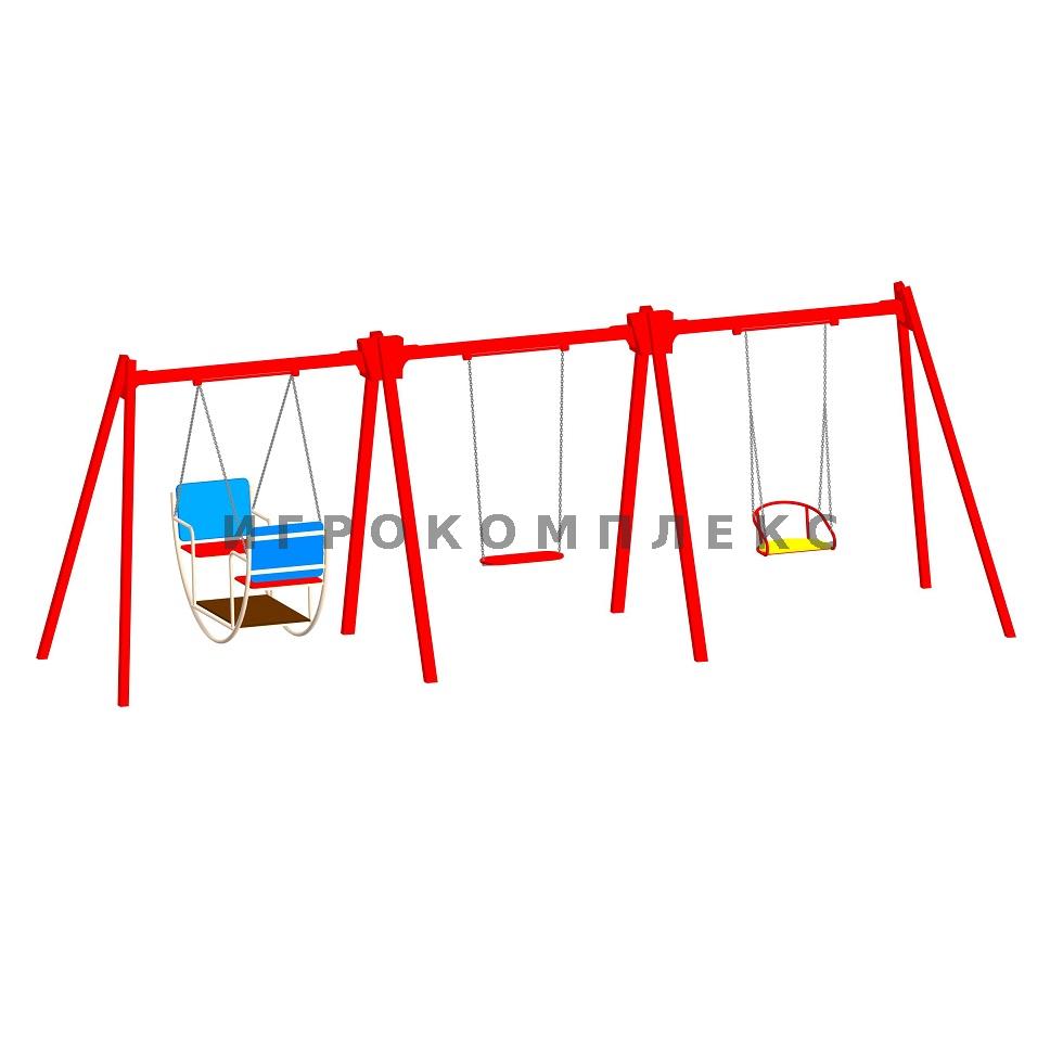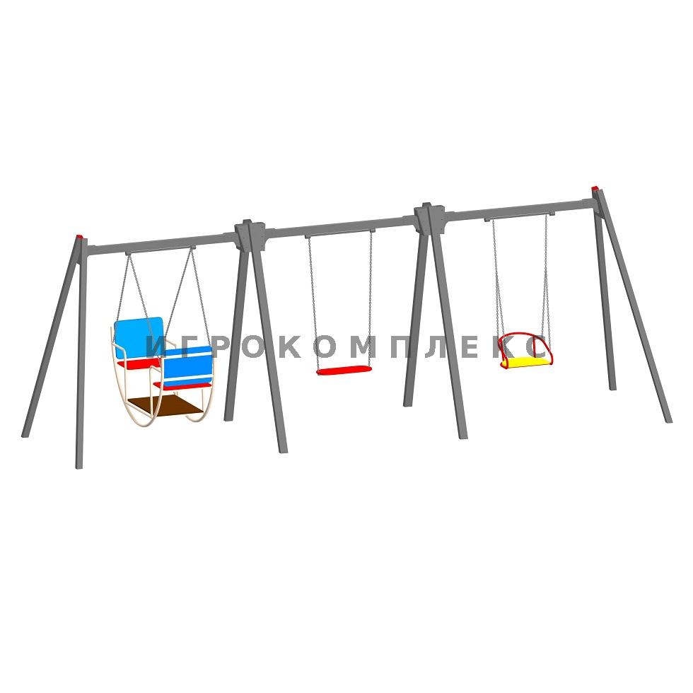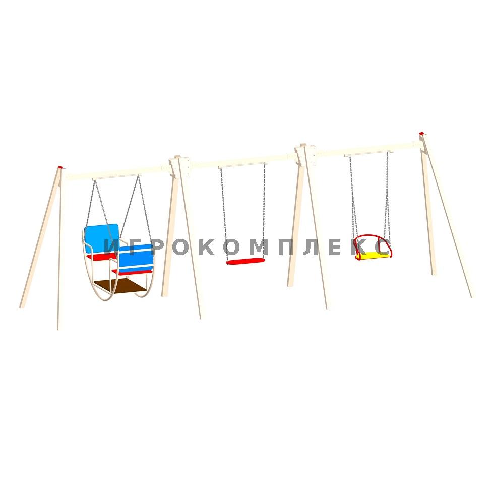 Качели детские К-3.6-с6п3п1 комбинированные для трёх подвесов с сиденьем высотой 2,1м используются на детской площадке.