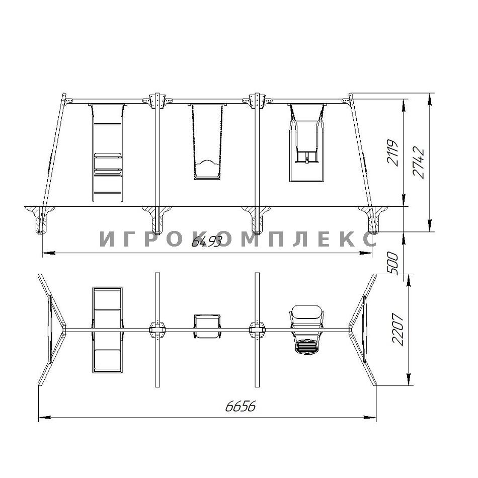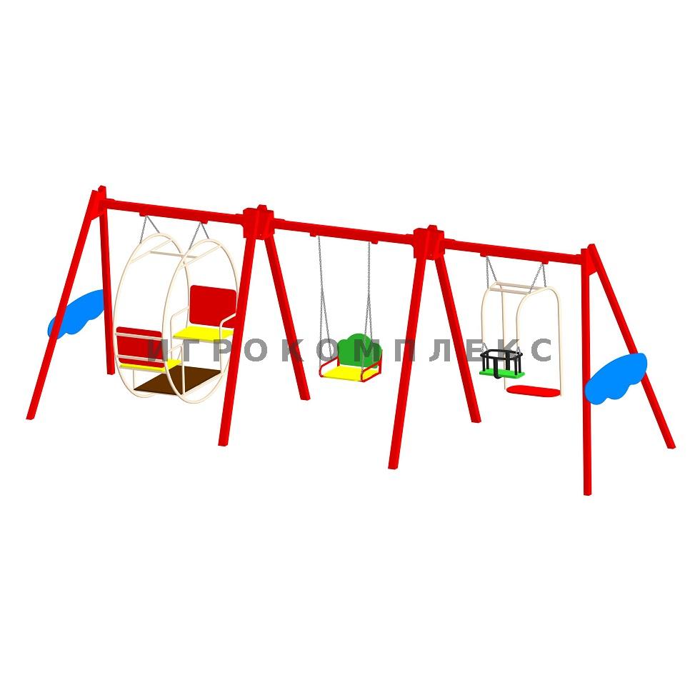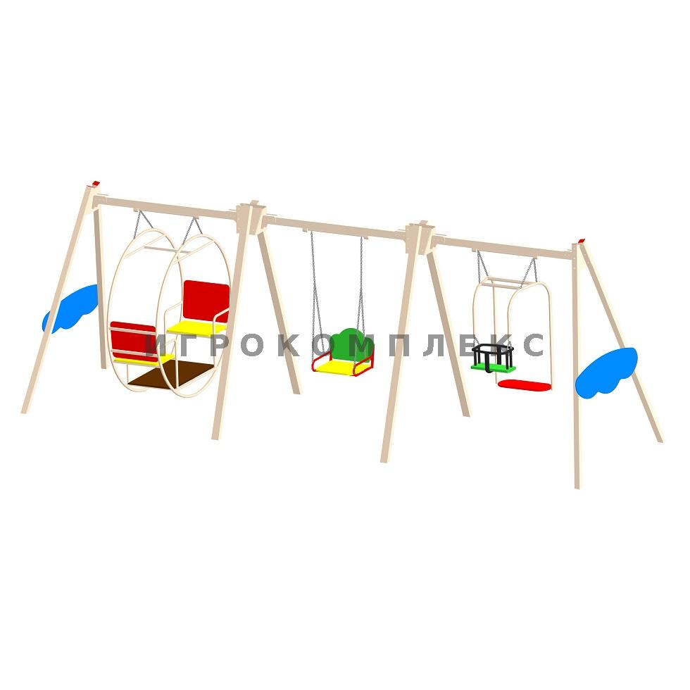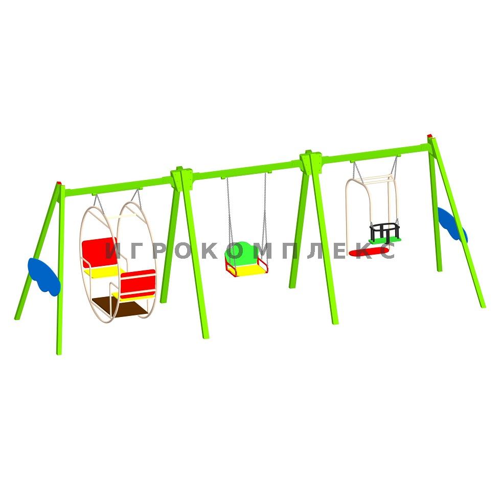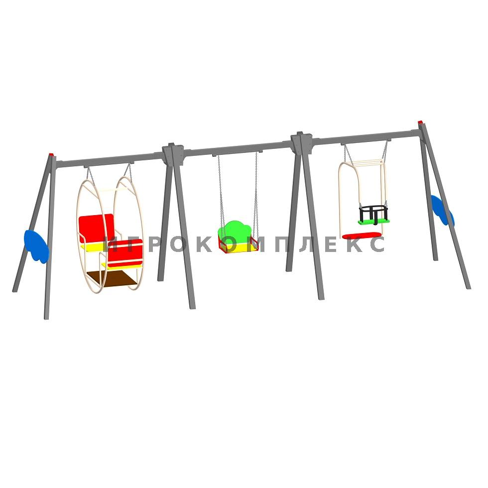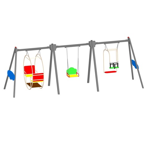 Качели детские К-3.6-с4п2с5д1 комбинированные для трёх подвесов с сиденьем высотой 2,1м используются на детской площадке.