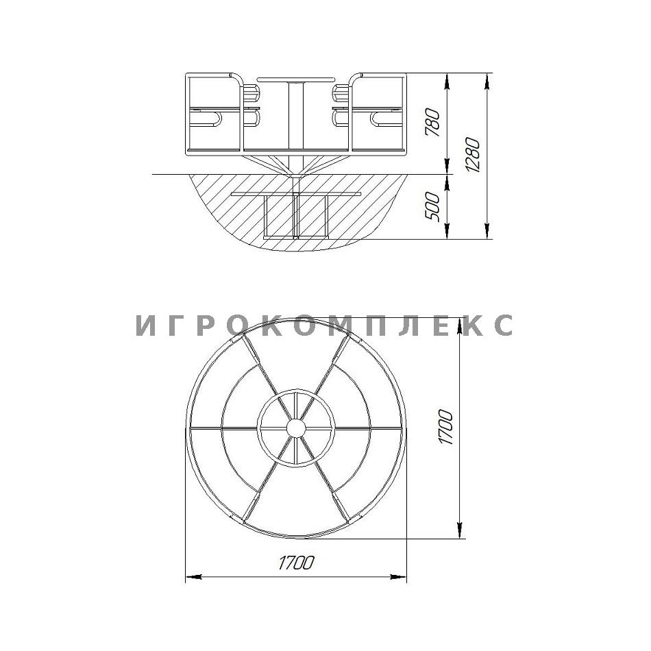 Карусель представляет собой цельносварную конструкцию, состоящую из основания и вращающейся платформы на 6 посадочных мест.