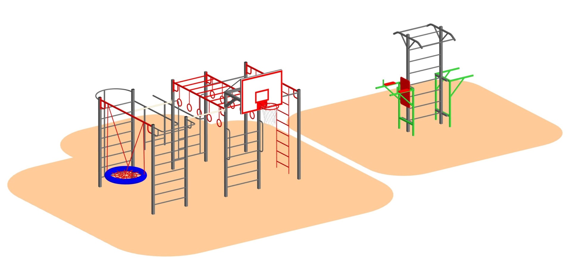 В состав входит: площадка, баскетбольный щит, скалодром с канатом, винтовой лаз, лаз Паутинка, бум, 2 разновысокие шведские стенки.